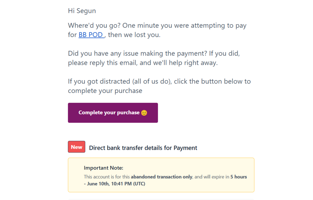 Instead of simply sending the usual automated abandoned cart email, we now include a unique virtual bank account that they can pay into right from their abandoned cart email.