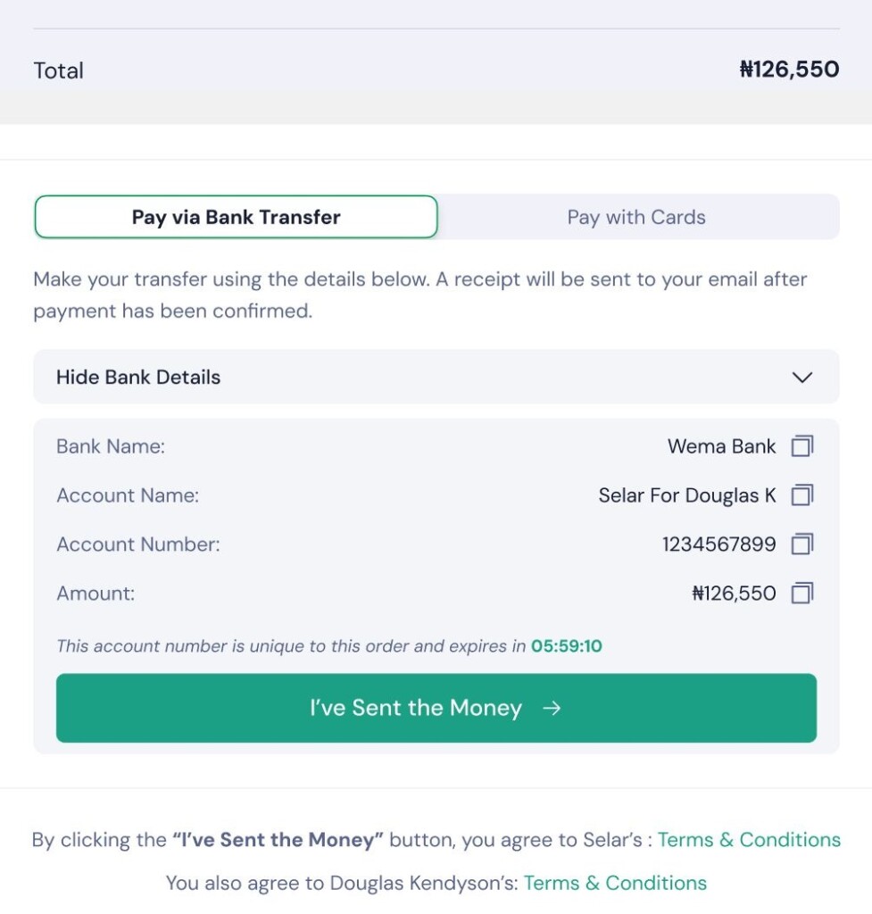 There’s no extra set up required on your end. When a customer wants to buy a product from your Selar store, they’ll see the option on a side screen to pay via bank transfer or cards. They can choose what works for them and complete the transaction in no time.